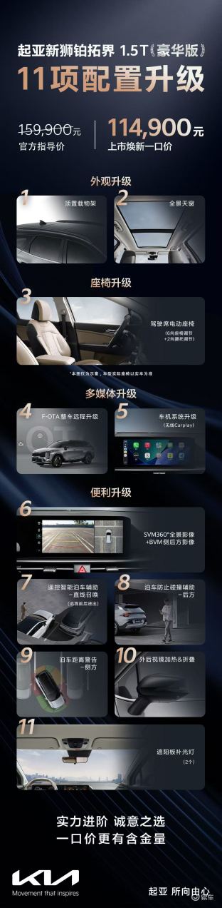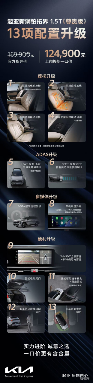 L2级智能驾驶、全系标配8AT变速箱、2,755mm越级轴距、11英寸HUD昂首裸露系统,将以上硬核设置沿路放到一台合伙紧凑级SUV上,居然只好10万多的价钱!近期,起亚新狮铂拓界以世界长入“焕新一口价”10.99万元起的价钱端庄上市,更有金融礼、试驾礼、养护礼、狮友礼、选装礼5大尊享礼遇加合手,真的将升维设置、越级享受的性价比拉到了极致。